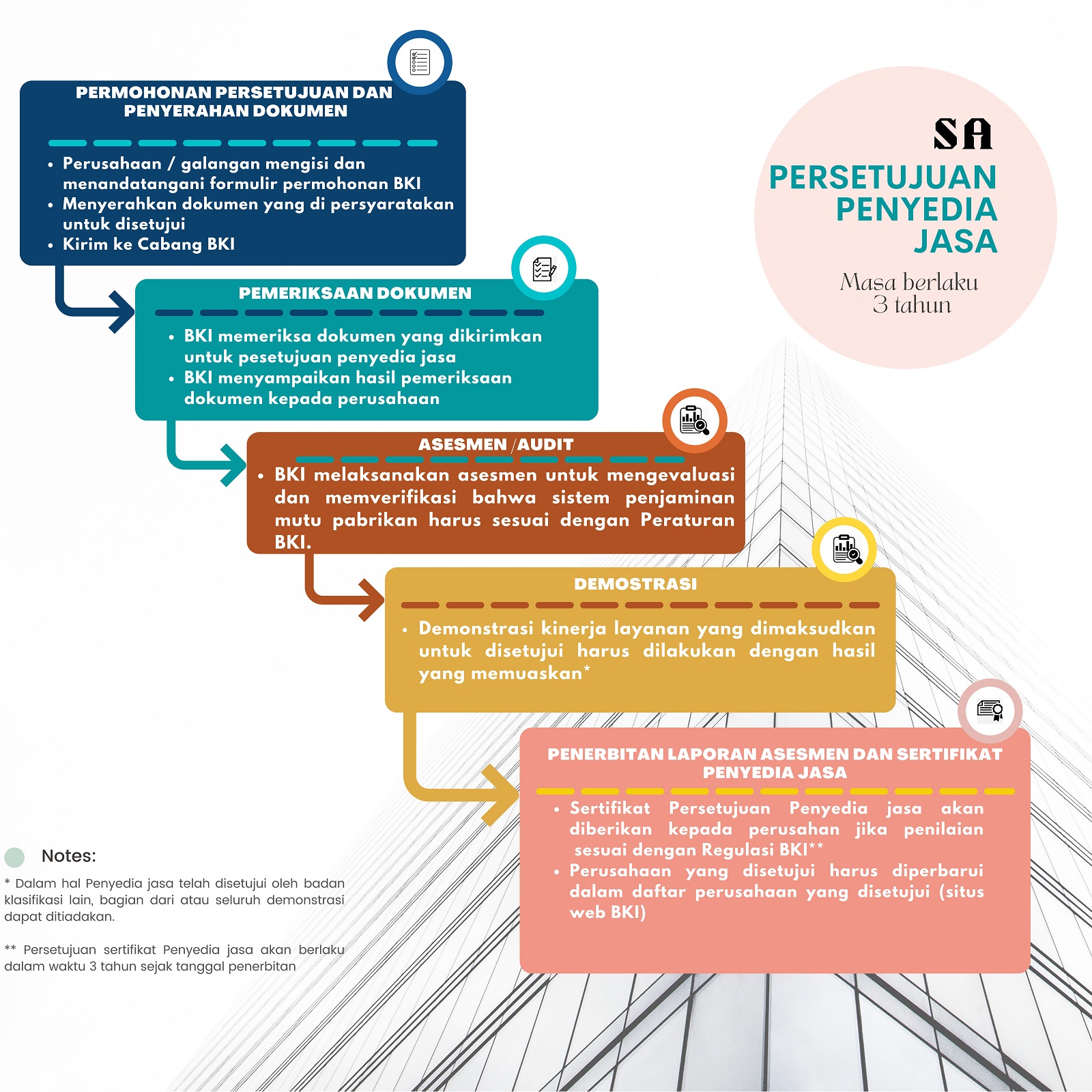 Persetujuan penyedia Jasa adalah untuk menilai dan menyetujui penyedia jasa, untuk memastikan penyedia memiliki kemampuan yang cukup untuk mengevaluasi bahwa produk memiliki kualitas seperti yang dipersyaratkan oleh Rules for the Classification and Construction of Seagoing Ships dan peraturan BKI lainnya.